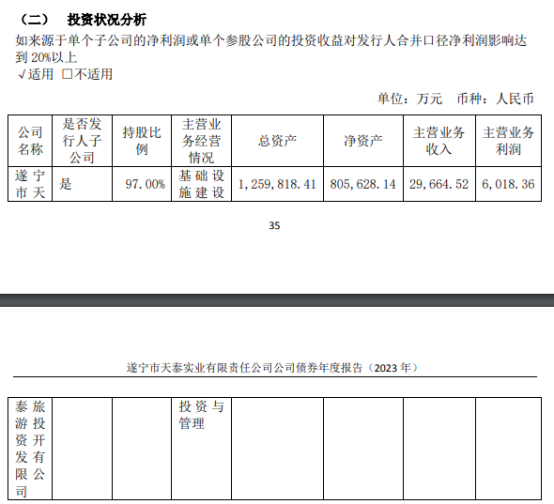 天泰实业债券2023年年度报告显示,天泰旅游2023年营收为2.97亿元,主营业务利润为6018.36万元;截至去年年末,天泰旅游总资产为125.98亿元,净资产为80.56亿元。